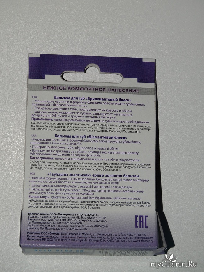 В итоге, я прикупила себе гигиенический бальзам для губ «Бриллиантовый блеск» от фирмы "Биокон".