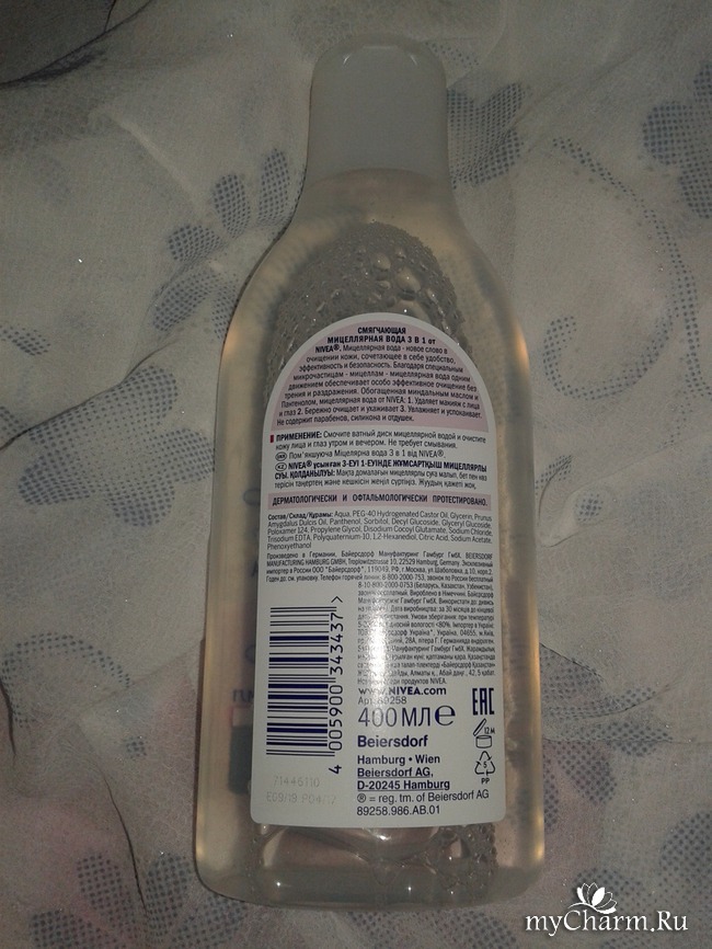 Смягчающая Мицеллярная вода от Nivea находится в прозрачном пластиковом бутылечке с откидной крышечкой. Объем внушительный - целых 400 мл. Данная мицеллярная вода призвана удалять макияж с лица и глаз, бережно очищая и ухаживая за кожей. Подходит для сухой и чувствительной кожи, но и моей жирной коже данная "мицеллярка" также подошла самым лучшим образом.