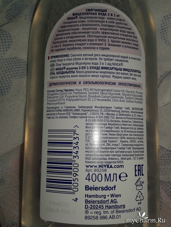 Смягчающая мицеллярная вода от Nivea не содержит парабенов, силиконов и отдушек. Однако не обошлось без другой "химии" в составе, но насколько мне известно, бренд Нивея не является производителем 100 % натуральной косметики. Для меня же в данном случае важен результат, и пожалуй не менее главным служит тот факт, что продукт не вызвал аллергии или раздражения.