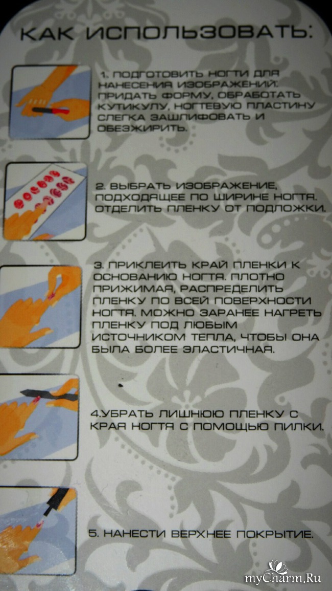 На обратной стороне упаковки с пленкой есть подробная инструкция по ее применению на ногтях.