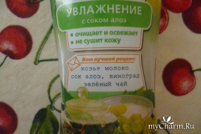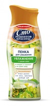 Это нежная увлажняющая пенка для умывания с соком алоэ, экстрактом винограда, зеленого чая и козьим молоком. Сразу же хочется отметить симпатичный, очень милый красочный дизайн упаковки с тонким намеком на натуральность состава этого средства. Пластиковый флакон, привычной всем формы, в духе «Ста рецептов» смотрится миниатюрно и красиво.