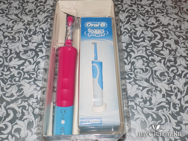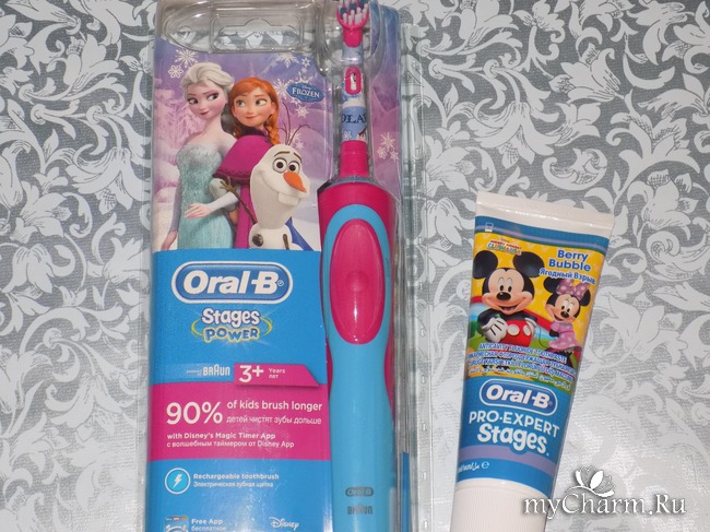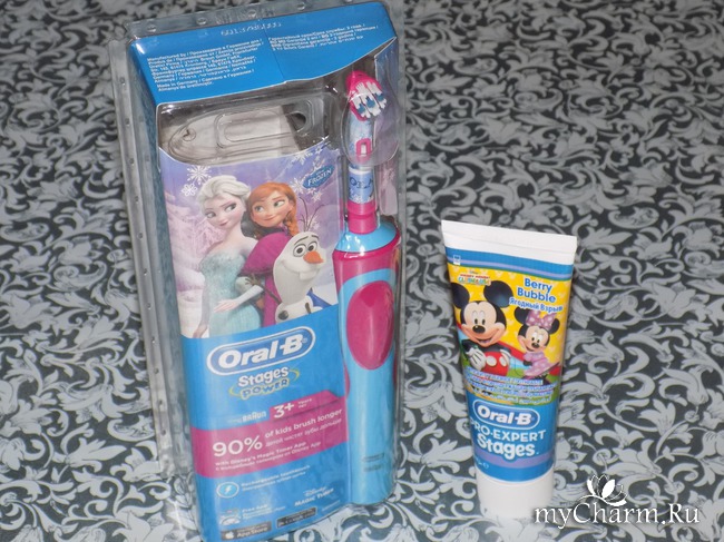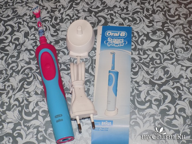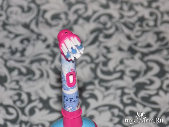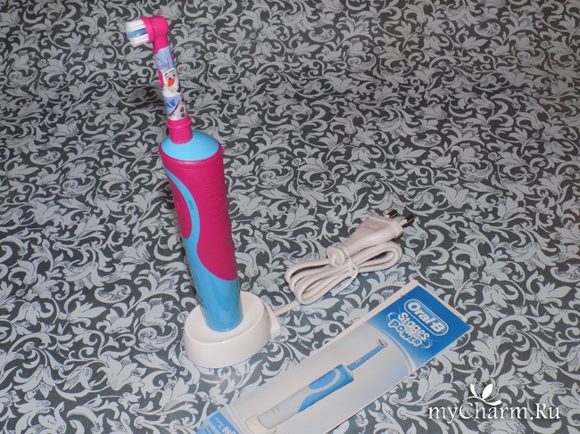 В комплекте кроме зарядного устройства была еще щетка-насадка, на которой были нарисованы персонажи диснеевского мультфильма. Такую щетку насадку Oral-B производители рекомендуют заменять один раз в три месяца. Я еще после использования промываю щетку с детским мылом.
