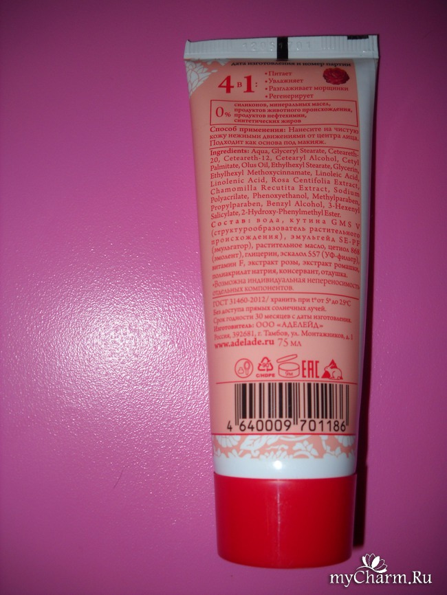 Эффектная ярко-красная роза на приятном глазу розовом фоне уже одним своим видом вызывает желание поскорее попробовать новое средство! Производитель позиционирует его как 4 в 1, так как данный крем отлично питает и увлажняет кожу, а также принимает активное участие в процессах клеточной регенерации и наделен способностью разглаживать морщинки! Кроме того, он всячески способствует устранению малейших признаков уставшей кожи, быстро успокаивает ее и помогает сделать ее упругой и эластичной. Регулярное использование крема помогает нормализовать активность чрезмерно разбушевавшихся сальных желез, выровнять цвет лица, повысить защитные свойства кожных покровов, а также разгладить меленькие морщинки и предотвратить возникновение новых.