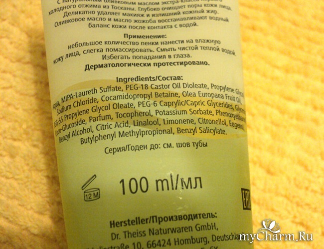 В составе должно быть натуральное оливковое масло экстра-класс первого холодного отжима из Тосканы. Это самый полезный сорт масла, который сохраняет все свои полезные вещества. Смотрим, где он в списке ингредиентов: Olea Europaea Fruit Oil значится седьмым по счету, в первой половине списка. Это означает, что масла в составе немало. Такой факт обнадеживает.Есть здесь привычное нам словосочетание «Laureth Sulfate», но в несколько другой интерпретации: «MIPA Laureth Sulfate». Это самая мягкая разновидность сульфата, которая не пересушивает кожу, и применяется это ПАВ в продуктах для очень сухой кожи. Спасибо за эту чуть-чуть более мягкую альтернативу сушащим ПАВ!