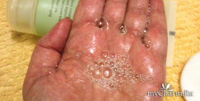 Внешне средство абсолютно прозрачное, пахнет приятно, без намека на масла (они иногда не очень приятно пахнут). В целом, приятные ощущения, и я бы купила эту пенку вновь, если бы не сломанные ногти от ужасно тугой крышки!