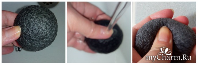 Пропитка его быстро смылась. Но и просто, смоченный обычной водой, Конжаковый спонж прекрасно очищает лицо. Если есть необходимость, производитель советует наносить на него любое моющее средство, каким вы умываете лицо.
