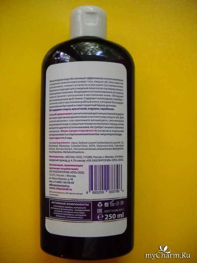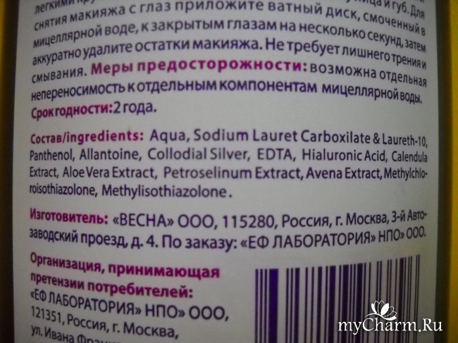 На обратной стороне флакончика указаны сведения о производителе, коим является находящееся в столице ООО «Весна», а также контакты уполномоченной на прием претензий от потребителей организации.