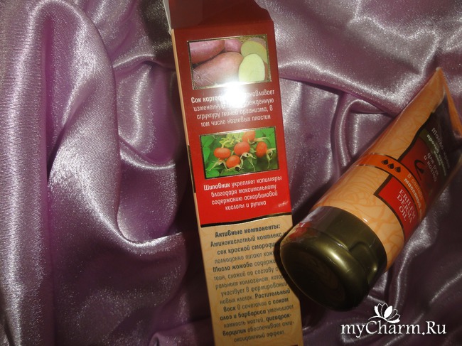 Кроме масел крем содержит сок красной смородины, сок картофеля, растительный воск, экстракт алоэ, специально разработанный компанией "Венец Сибири" комплекс "Активный кремний 1", глицин, цистеин, метионин и L-аргинин. И это еще не все! В составе также сок барбариса, дигидрокверцетин, композиция эфирных масел (не указано, каких именно).