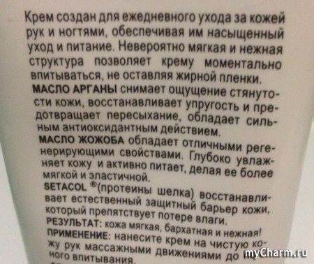 Использовать крем достаточно приятно (а я это делаю несколько раз в день). Он очень хорошо ложится на кожу. Легко распределяется и очень быстро впитывается. Это особенно важно в креме для рук, ведь ходить с жирными руками и долго ждать, пока крем наконец впитается, не нравится никому. А тут нанес, распределил и все – ручки гладенькие и нежные. Буквально через несколько секунд после нанесения вы не почувствуете крема ни на поверхности рук, ни на пальцах, которыми размазывали его. Никакой жирной пленки на руках нет, и соответственно не остается и жирных следов от рук ни на одежде, ни на мебели.