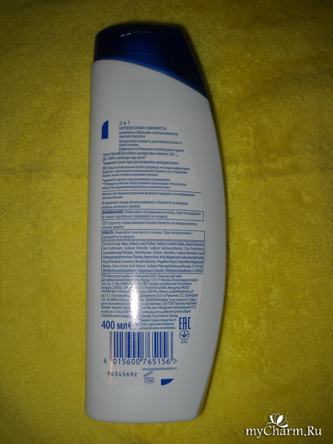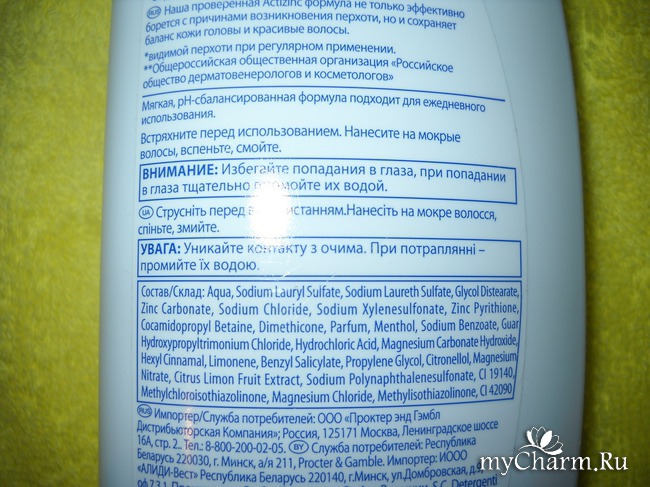 На обратной стороне весьма увесистого флакончика объемом в 400 мл я нашла наиподробнейшие сведения о самом товаре, о производителе, о составе и о способе применения. Именно отсюда я почерпнула ценную информацию о том, что в составе данного шампуня присутствует Actizinc формула, которая не только эффективно борется со всевозможными причинами появления перхоти, но еще и позволяет сохранять красоту волос, а также поддерживать надлежащий баланс кожи головы. А мягенькая, сбалансированная pH-формула делает это прекрасное средство подходящим для ежедневного применения (сама я обычно мою голову через день).