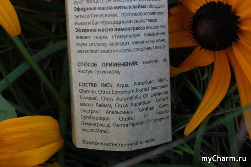 Состав замечательный и полностью натуральный. В нем нет парфюмированных отдушек, а приятный цитрусовый запах обусловлен за счет добавления экстракта лимона, апельсина и эфирных масел лайма и лемонграсса. Отличный освежающий аромат, подойдет как для мужчин, так и для женщин. Цитрусовые экстракты и масла в дезодоранте являются не только замечательной натуральной аромакомпозицией, но и обладают антисептическим, противовоспалительным и тонизирующим действием. Функцию защиты от неприятного запаха выполняют алюмокалиевые квасцы (Potassium Alum). В отличие от антиперспирантов, они не блокируют работу потовых желез, а нейтрализуют запах пота.
