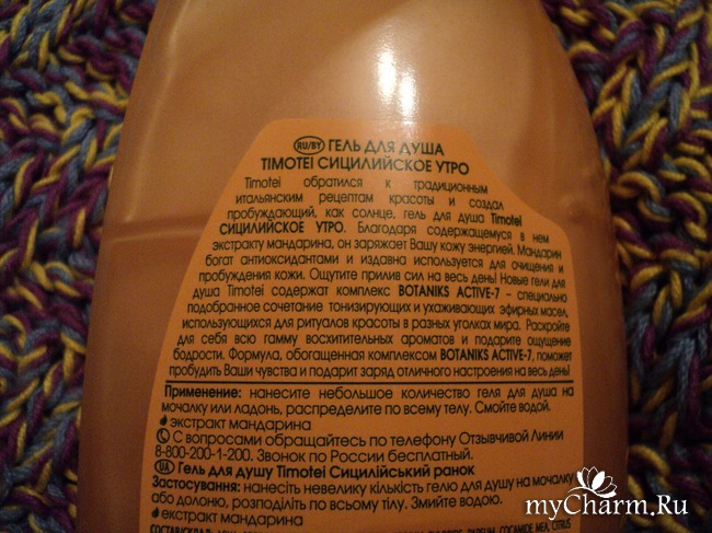 Многие скажут, какая увлажненность, о чем ты говоришь?! Не единожды я писала, что моя кожа чересчур сухая и очень чувствительная, неправильно подобранный гель и появляется чувство стягивания, хочется поскорее нанести увлажняющую эмульсию или лосьон. Используя гель Сицилийское утро Мандарин, процедура увлажнения не требуется, что я считаю не только приятным дополнением, но и существенной экономией. Чем еще интересен гель от Timotei? Своим составом! Конечно, он далек от идеального, но натуральных компонентов в нем немало.