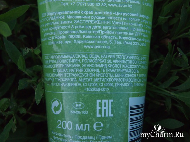 Во-первых, это аромат! Не зря на упаковке белеет название: Пробуждающий цитрусовый заряд. Это действительно цитрус: лимон, апельсин, что-то свеженькое и освежающее. Конечно, безумно пробуждающего аромата вы не получите, но этого и не нужно ждать от Avon, где в составе сплошная химия (да простит меня производитель!). Но принимать душ с таким скрабом мне лично доставляет некое удовольствие, для меня это своего рода заряд. Но аромат проходит вместе со стекающей по вашему телу водой, прекрасно для тех, кто не любит источать после ванны благоухающие отголоски примененных средств.