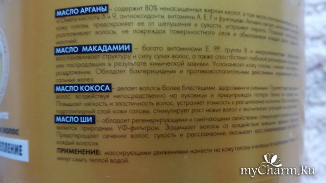 В состав маски входят четыре масла: арганы, макадамии, кокоса и ши.