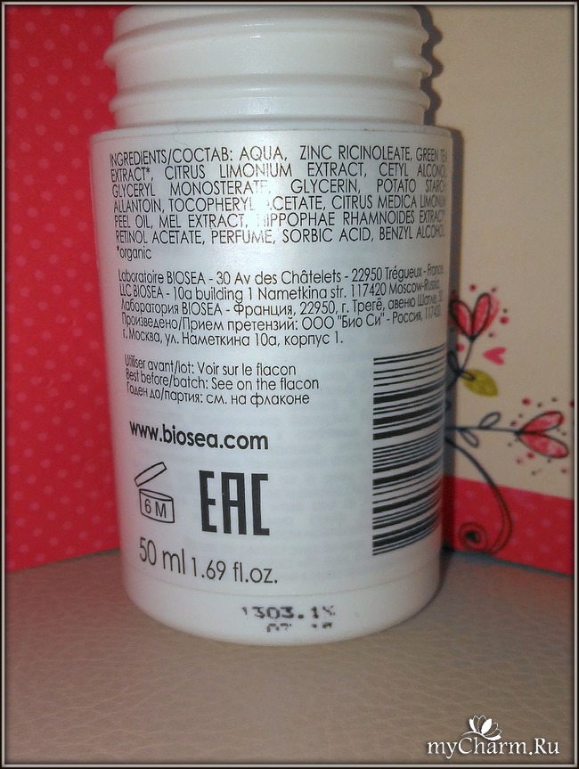 С обратной стороны есть информация о составе продукта, его производителе, сроке годности и знак сертификации – ЕАС. Один из минусов продукции Биоси в том, что срок годности и номер партии во многих случаях печатаются прямо на флаконе. Из-за этого надпись быстро стирается, даже не дойдя до покупателя. Я не могу быть уверена в том, что я использую качественное средство.