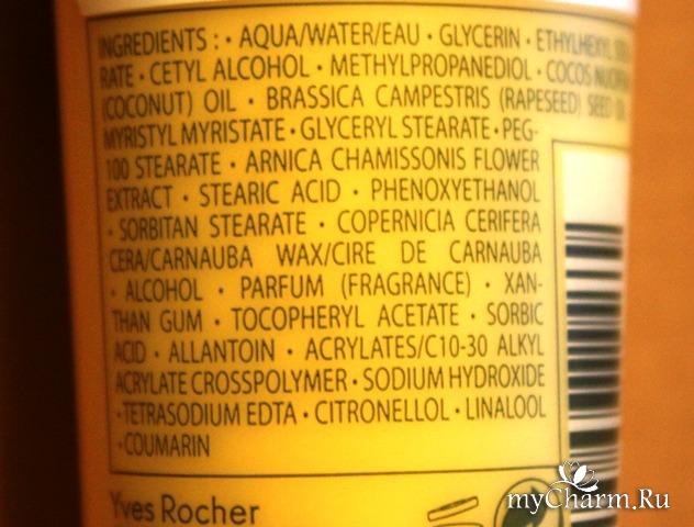 Увлажняющий крем длительного действия Ив Роше содержит такие полезные компоненты, как экстракт арники, масло ядра кокосового ореха, масло рапса, 100% растительный глицерин и карнаубский воск. Безусловно сама состав гораздо шире, поскольку дополнен водой, парфюмированными отдушками, консервантами. В целом, я не нашла ничего криминального и с радостью сделала покупку.