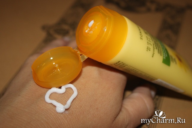 Почему я его выбрала? Даже не знаю. Наверное, летом, особенно таким дождливым и прохладным, тянет на солнечные цвета. А тюбик у крема, действительно, яркий! Сама туба выполнена из полупрозрачного желтого матового пластика, а дополнением по цвету служит оранжевая крышка с защелкивающимся клапаном.