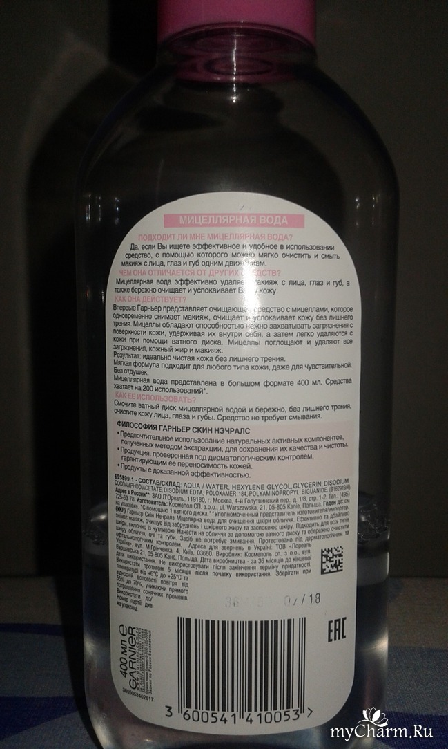 Как ее использовать? Достаточно смочить один-два ватных диска этой мицеллярной водичкой и очистить нужный участок лица без трения. Мне, чтобы удалить свой обычный макияж, требуется один ватный диск на один глаз, соответственно дисков нужно побольше. Но это кому как. Кстати, на обратной стороне указано, что за счет большого объема средства хватает на 200 применений. Но лично я при использовании как-то не считала, но могу лишь сказать, что потратила около половины этой мицеллярной воды почти за год применения. Но пользовалась ей не только чтобы снять макияж, но и для того, чтобы просто очистить кожу, ведь за день она и без косметики здорово загрязняется. Хочу также обратить внимание на то, что средство не имеет какого-либо запаха, так как оно без отдушек. Для меня это очень даже хорошо, ведь бывает, что запах у средства слишком резкий и именно по этой причине мы перестаем им часто пользоваться.