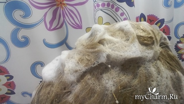 Волосы я мою раз в два дня, мне так комфортней. Под душем хорошо смачиваю волосы. В ладонь наливаю немного шампуня, на мои волосы его требуется примерно столовая ложка, растираю его между ладонями, а потом уже наношу на мокрые волосы. Массирую голову руками, вспенивая шампунь на волосах. Пенится шампунь очень хорошо.