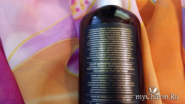 На обратной стороне флакона, такая же черная этикетка с "золотыми" буквами. здесь можно ознакомиться с тем, что же даст нашим волосам шампунь Дегтяревъ с пептидами. Так же с составом и способом применения. Использовать шампунь нужно так же как обычно. Нужное количество наносим на влажные волосы, массируем, чтобы появилась пена и смываем чистой водой. Качество продукции контролируется по международному стандарту ISO 9001.