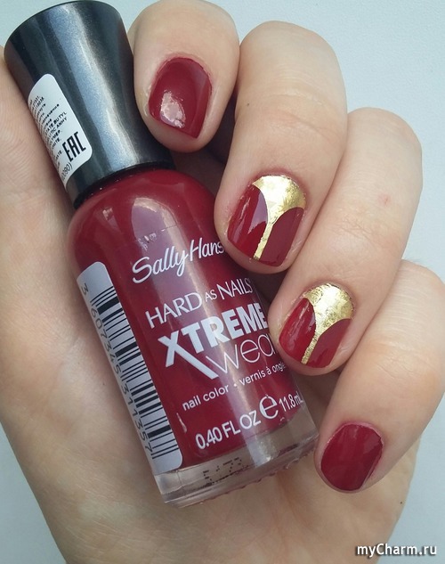 Золотистый слайдер из фольги с переливающимся узором я использовала с лаком бордового цвета. По-моему это сочетание беспроигрышно :) Результат моего, не побоюсь этого слова, труда: