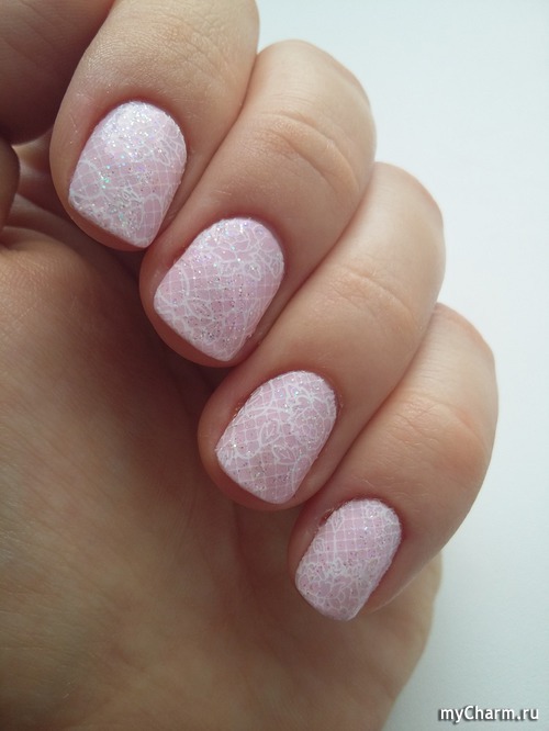 Следующий вариант маникюра - узорчатый рисунок, фоном для которого я выбрала голубой лак. На коротких ногтях смотрится не столь прекрасно, но интересно и очень нежно: