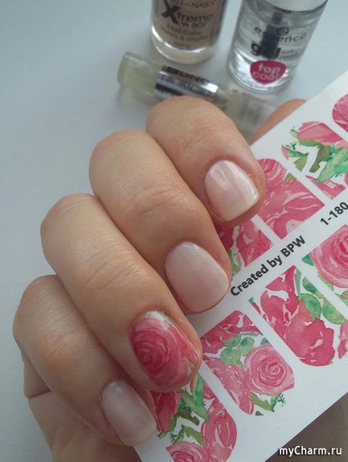 Затем на несколько секунд опускаю в теплую воду, отсоединяю пленку и прикладываю к ногтю. В принципе, все по инструкции ;). Слайдер скользит по ногтю, то есть выбрать поле покрытия ногтей пленкой очень просто. Через некоторое время слайдер подсыхает и фиксируется. Излишки я убирала апельсиновой палочкой. Последний штрих - нанесение топа.