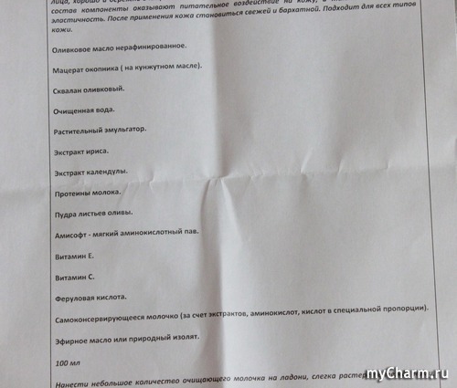 Помимо нерафинированного оливкового масла молочко также содержит пудру листьев оливы. Она способствует удержанию влаги в коже, обладает высокими регенерирующими и заживляющими свойствами.