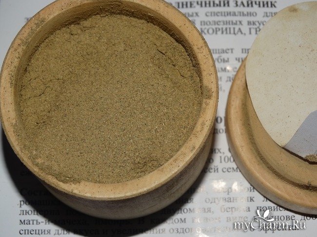 Ну что ж, я её убрала. Визуально порошок выглядит... ну как порошок. Точнее как мука из трав. Имеет коричневый оттенок. Кстати, с бочонком вполне гармонирует.