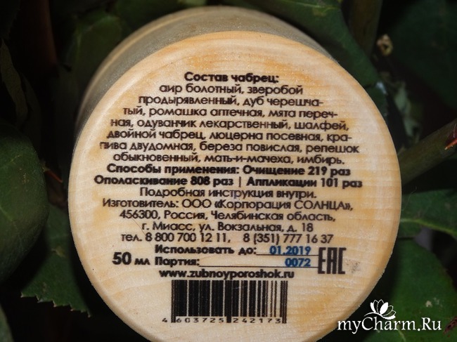 На крышке бочонка расположено наименование продукта. А на дне - полный состав - абсолютно натуральный, как видите. Сразу вспоминается строчка из песни: "Травы, травы, травы..." Да и вообще "Фабрика трав" уже зарекомендовала свои товары как действительно полезные, не содержащие никакой "химии"!
