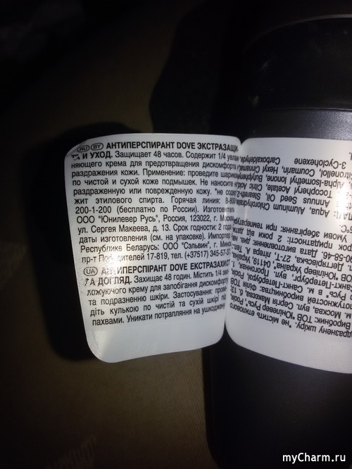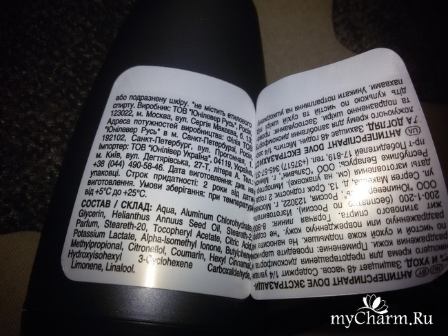 На оборотной стороне подчеркнуто, что этот дезодорант не только защищает, но и ухаживает за кожей, что характерно для всей линейки товаров от Дав. Почти все средства от этой марки на четверть содержат в себе увлажняющий крем. Он отвечает за бережное и мягкое воздействие на кожу.