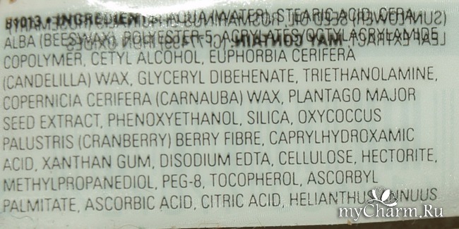 Итак, состав туши. На первом месте по количеству вода, затем идут различные составляющие туши, такие как воск, о полезности которого известно довольно широко. Канделильский воск, который добавляют для стойкости.