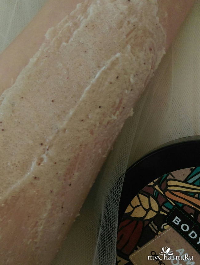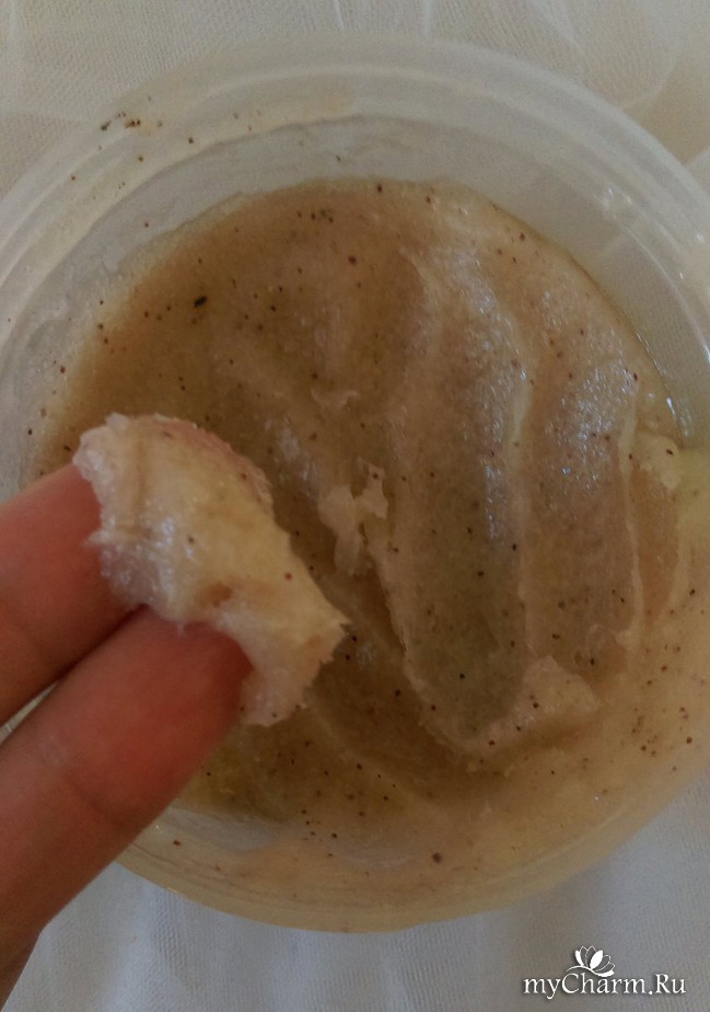 Скраб очень густой, по текстуре напоминает засахарившийся мед, и за счет этого он экономичный. Хотя с объемом в 450мл об экономии можно и не думать. Скраб не очень жесткий и подойдет для всего тела, даже для такой нежной зоны как декольте.