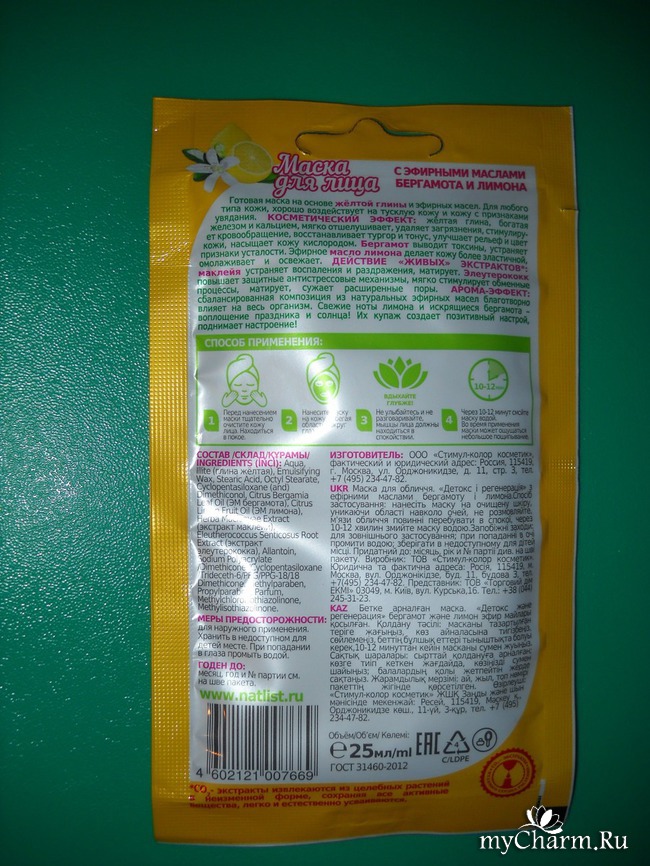 Обратная сторона заветного пакетика снабжена более подробной информацией о его содержимом – эта удивительная масочка отлично подходит для всех типов кожи и благоприятно воздействует на кожу с видимыми признаками увядания. Полезной будет она и для тусклой или утратившей свежий вид кожи.