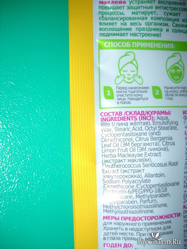 На упаковке есть небольшое предостережение – оказывается, во время использования этой замечательной маски кожа может чувствовать небольшое пощипывание. Это действительно так, но никакого дискомфорта данное пощипывание не доставляет.