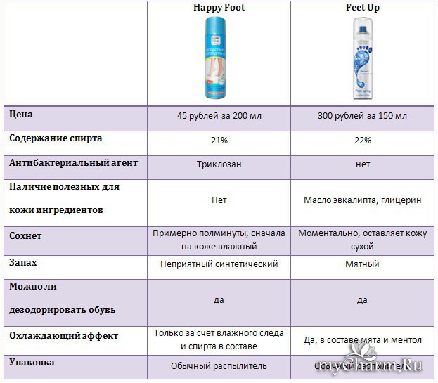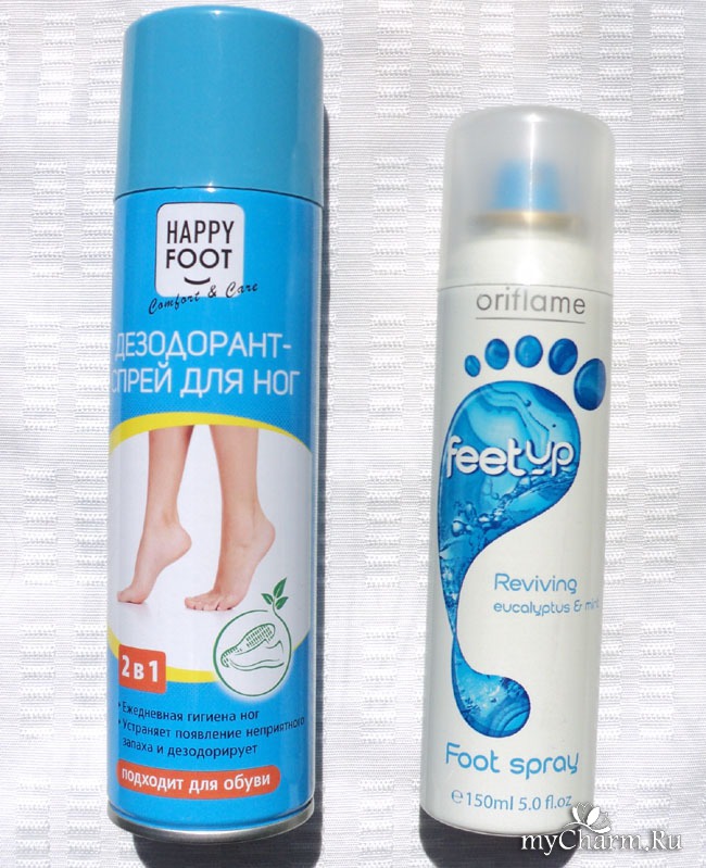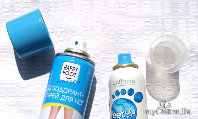 Судя по отзывам на нашем сайте, одним из лидеров среди дезодорантов для ног является серия Feet Up от Oriflame. Поэтому я выбрала для сравнения этот продукт, и к счастью, он у меня тоже есть.Что получается: Данный дезодорант Happy Foot в сравнении с аналогичным от Орифлэйм, показал явные недостатки. В нем нет компонентов, улучшающих состояние кожи, нет охлаждающего эффекта (только за счет наличия в составе спирта и влажного следа), и очень неприятный запах. То есть, этот дезодорант явно не для кожи ног. Тяжело его применять на ноги. Но для обуви это средство может быть оптимальным, поскольку полностью убирает неприятный запах пота, при этом обладает антибактериальным эффектом, доступно по цене.