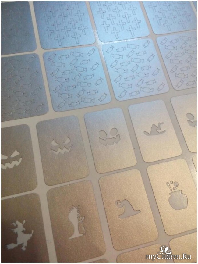 Второй набор "Ногтевой шабаш". В нем представлены трафареты в стиле Хеллоуина, там "мордочки" для тыквы, ведьмочки, мётлы, приведения, конфетки и прочее.
