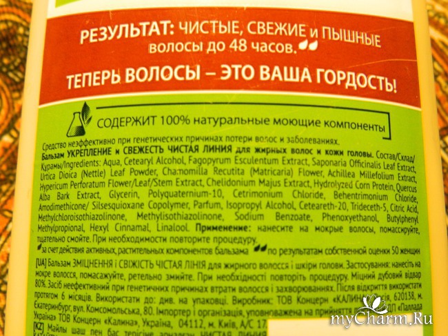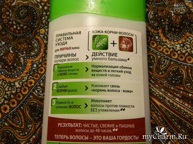 Вместе с шампунем Бальзам для волос Умный №1 Укрепление и свежесть спасает и от излишней жирности волос и кожи головы: после пары месяцев применения могу с уверенностью сказать, что загрязняться волосы стали реже, и возникает ощущение, что кожного сала тоже вырабатывается меньше – особенно это заметно у корней волос.