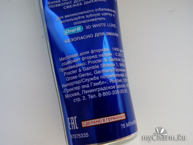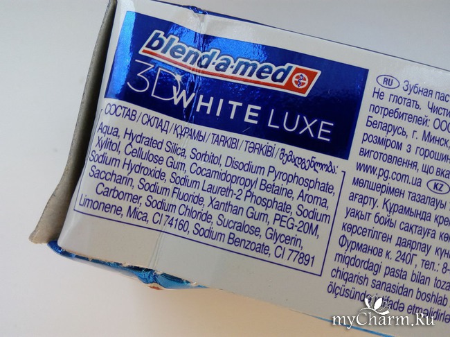 Итак, зубная паста облачена в стандартный тюбик, выполненный из мягкого пластика. К нему, в свою очередь, приложена картонная упаковка, на которой имеется информация обо всех важных аспектах, в том числе составе и принципе действия. Не могу не отметить привлекательный дизайн пасты, он покоряет переливающимися бликами серебристых, бутылочных, белых и синих оттенков.