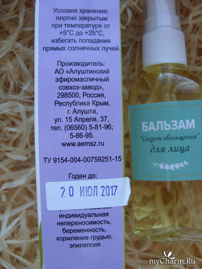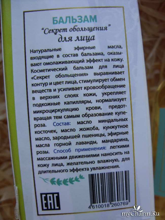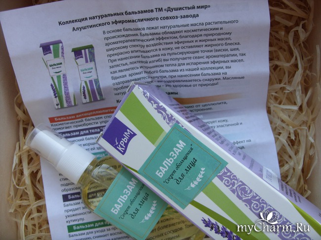 Итак, косметический бальзам для лица «Секрет обольщения» представлен в прозрачном пластиковом флаконе объемом 50 мл. В интернет-магазине можно найти и другую версию – объемом 100 мл. Флакон оснащен крышкой, под которой кроется дозатор, позволяющий получить порцию волшебного эликсира, достаточную для одного применения. Экономичность, как говорится, на лицо! Нужно отметить, что сей продукт несет в себе сразу две функции – уход за кожей и ароматерапию, ведь в его составе числятся эфирные масла горной лаванды, мандарина и розы.К флакону приложена картонная коробка, на которую нанесена вся необходимая информация. Также к коробке приложен бумажный «буклет», повествующий обо всей коллекции натуральных бальзамов, поступающих в продажу под торговой маркой «Душистый мир». Кстати, ассортимент бальзамов огромен. В интернет-магазине вы сможете приобрести бальзамы для лица, тела, волос, рук, век, ногтей и ног. А еще в коллекции бальзамов присутствуют масла для и после загара и оздоровительные бальзамы (противопростудный, для суставов, универсальный и детский). Эта информация вам на заметку.