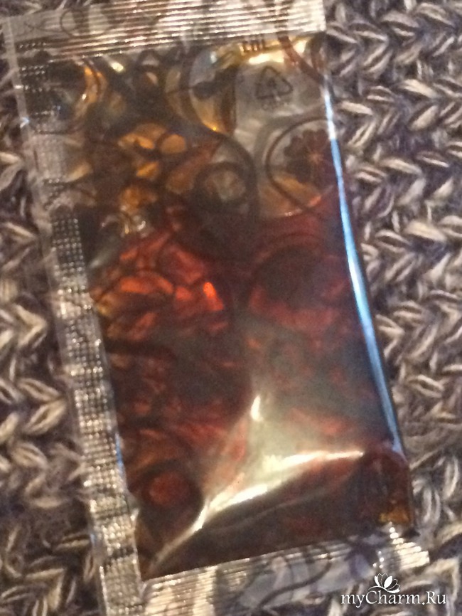 Консистенция средства жидкая. Цвет золотисто-коричневатый (точно не могу описать, но можно увидеть все на фото). Что касается аромата, то я не советовала бы принюхиваться к нему. В первый раз, когда после вскрытия пакетика захотела ощутить аромат, то начала чихать и немного запершило в горле. Но в целом он приятный, не считая перца, так как в составе есть и другие компоненты.