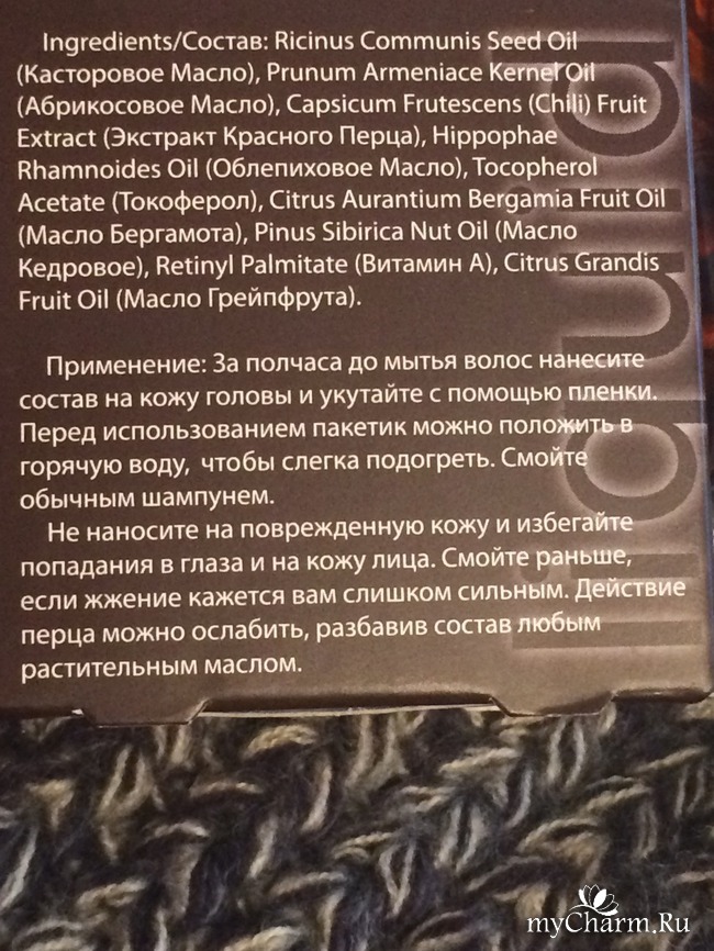 Перед тем как использовать средство, я внимательно прочитала применение. Вроде все понятно. А вот теперь расскажу мою первую смешную историю с применением. Вскрыла я пакетик и не задумываясь, стала наносить перец на корни и тщательно втирать. Только вот жаль, что производитель не указал, что лучше всего это делать в перчатках, так как кожа рук потом горела сильно. Ну да ладно, второй раз я делала уже в перчатках. На один раз мне хватило половины пакетика. Остальное я как следует завернула на следующий раз. Надела шапочку. Утеплять не стала, потому что и так после двух минут начало нещадно жечь. Но кстати ближе к получасу "пожар" немного утих. Потом я забыла про свою маску и пошла принять душ. И вот тут началось веселье. Забыла я что перчик то жгучий и давай как обычно потом смывать маску. Хочу сказать, что мой шампунь без сульфатов, парабенов и прочей гадости как-то плохо справился со смыванием масла. Да и вымывать средство из волос пришлось долго. В итоге горело у меня все тело (минут 15 бегала, не знала куда себя деть), но это по моей глупости.