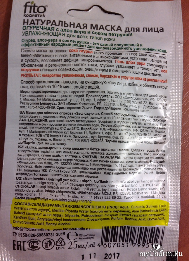 myCharm.Ru Для увлажнения кожи лица маска Огуречная от Фитокосметик вам нужна