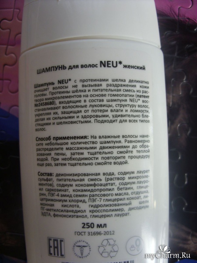 Использовать сей косметический продукт просто как дважды два. Наносим порцию шампуня на увлажненные волосы, распределяем массажными движениями и смываем очищенной теплой водой. Удаляется пена в считанные секунды, а на прядках остается легкий и приятный аромат, который сопровождает меня в течение суток.Для получения наилучших результатов сей продукт рекомендуется применять с бальзамом-кондиционером NEU*. Он, в свою очередь, бережно питает, укрепляет локоны, активизирует их рост и дарит им силу и здоровое сияние. К сожалению, в моем арсенале этого продукта не числится, но производитель порадовал меня чудесным подарком – тремя одноразовыми пакетиками бальзама-кондиционера. И теперь в списке будущих покупок этот продукт числится на первых позициях.