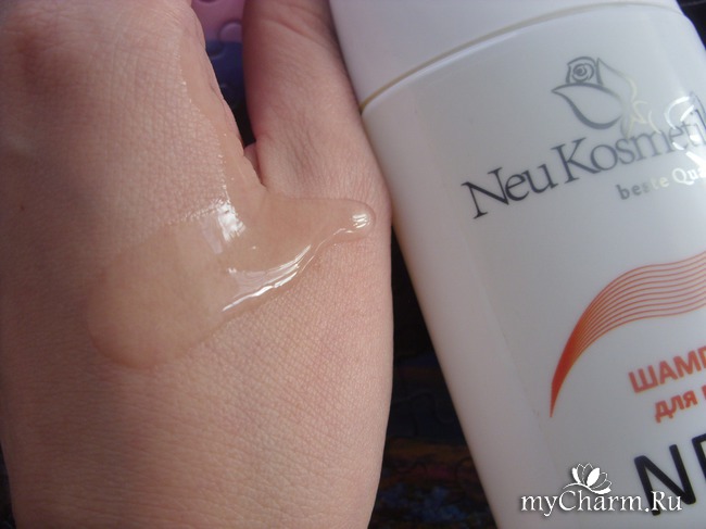 Шампунь от Neu Kosmetik обладает не слишком жидкой прозрачной консистенцией. Аромат косметический, сладковатый, довольно приятный, резким его назвать нельзя, что является несомненным плюсом. Для одного применения достаточно небольшого количества шампуня, что говорит о его экономичности. А это в пору дефицита денежных средств - важный фактор. И, между прочим, стоимость шампуня вполне приемлема, и составляет 610 рублей. Ввиду того, что сего продукта мне хватит, как минимум, на 3-4 месяца (при помывке волос 2-3 раза в неделю), это очень выгодное и оправданное приобретение.Использование
