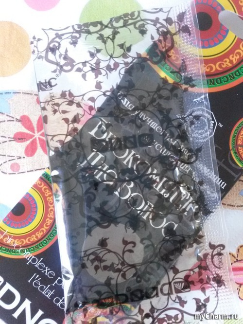 Внутри коробочки находится герметичный мини пакетик из прозрачного пластика, по всему пакетику в коричневом тоне изображены цветочки-листочки и аббревиатура DNC.