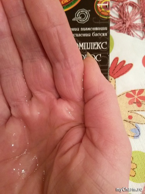 Масло с золотистым оттенком, запах специфический, не пойму кто лидирует в этом ансамбле, но надеюсь, что этот аромат не будет долго держаться на волосах. Консистенция легкая, не тяжелое масло, скорее даже маслянистая жидкость, но руки жирные, а вот как на волосах оно будет вести себя, проверяем.