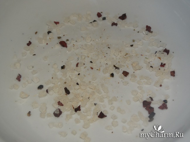 Заглянув внутрь коробочки, я обнаружила пакетик с самой солью. Она довольно крупная, что меня порадовало. Настоящая морская соль! Плюс дополнительные компоненты.