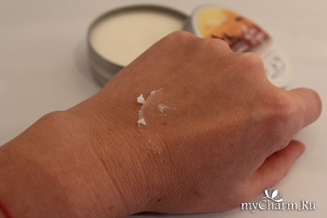 Бальзам легко наносится на кожу, и при соприкосновении с ней начинает буквально таять. Очень хорошо увлажняет кожу и смягчает. Не имеет жирного блеска, на теле не чувствуется. При нанесении на лицо нужно совсем немного бальзама, буквально с горошинку, так как он хорошо распределяется.