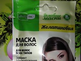 Это желатиновая маска с эффектом ламинирования из серии «Домашние маски». Данная маска подходит для всех типов волос. Содержит «живые» экстракты клевера и шалфея. С такими компонентами я еще ни разу не использовала маску, мне было очень интересно узнать какой эффект они дают. А вот с желатином я делала маски. Сама разводила его и в домашних условиях с обычной маской, эффект был превосходный. Для кудрявых волос самая действенная маска с желатином, она очень помогает убрать пушение волос.